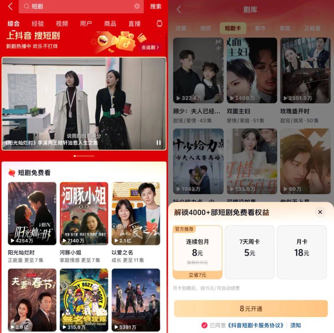 为了克服上述挑战,短剧会员服务应运而生,为用户提供了一种新的观看方式,同时也为合作方开辟了新的变现途径。以抖音短剧卡为例,用户可以享受千部短剧免费观看以及免广告特权,连续包月卡价格为8元,7天周卡5元,普通月卡18元。对于首次充值的用户,合作方可以获得充值金额的50%,而非首单则为30%。