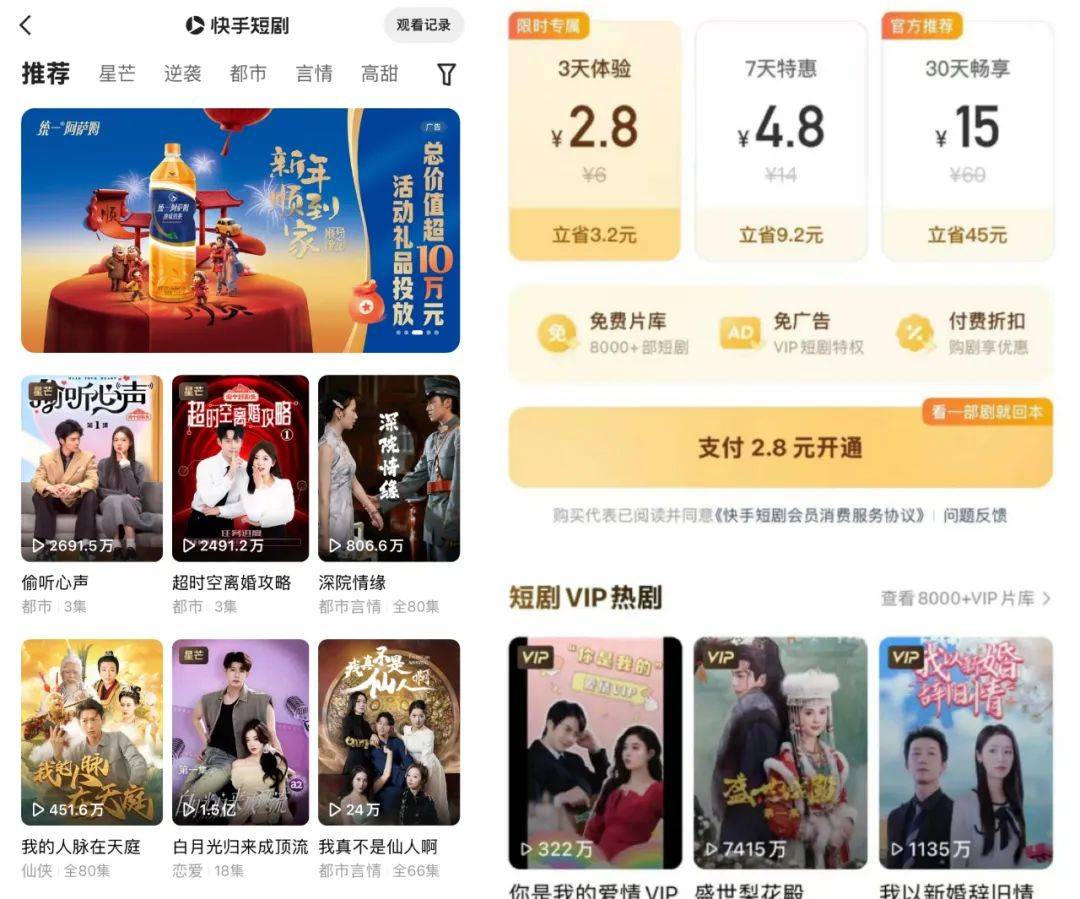 类似地,快手也推出了短剧会员服务,允许用户在一定期限内免费观看8000多部短剧,不同期限的会员卡价格分别为2.8元(3天)、4.8元(7天)和15元(30天)。快手还会根据短剧播放时长与合作方分成,且在新模式扶持期内,平台不会抽取任何佣金,确保100%的会员费收入归于合作方。